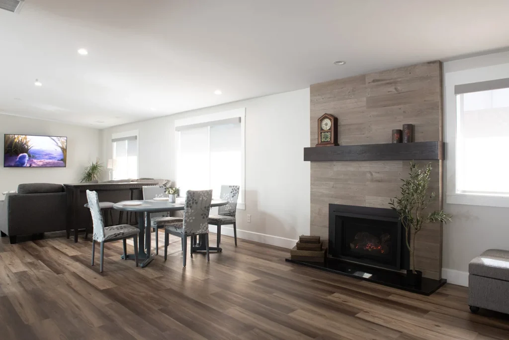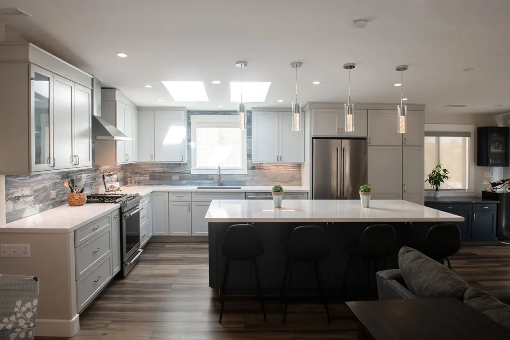 The remodel features a spacious kitchen with a large island at the center. With its dark wood finish, the island contrasts beautifully with the white countertops and cabinetry, creating a striking visual balance. The island also serves as a casual dining area with barstool seating.