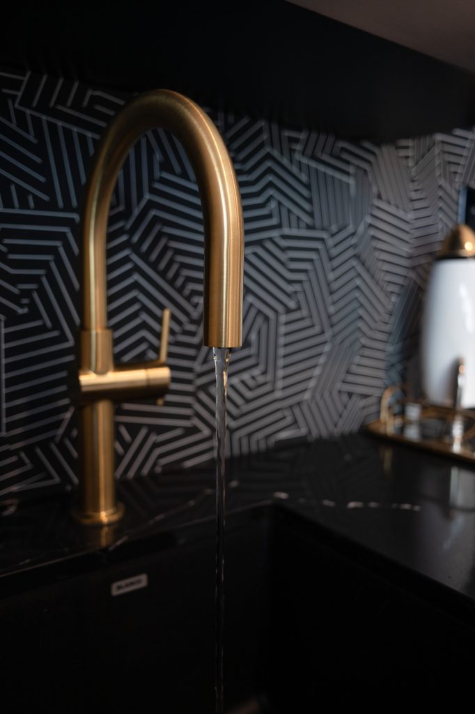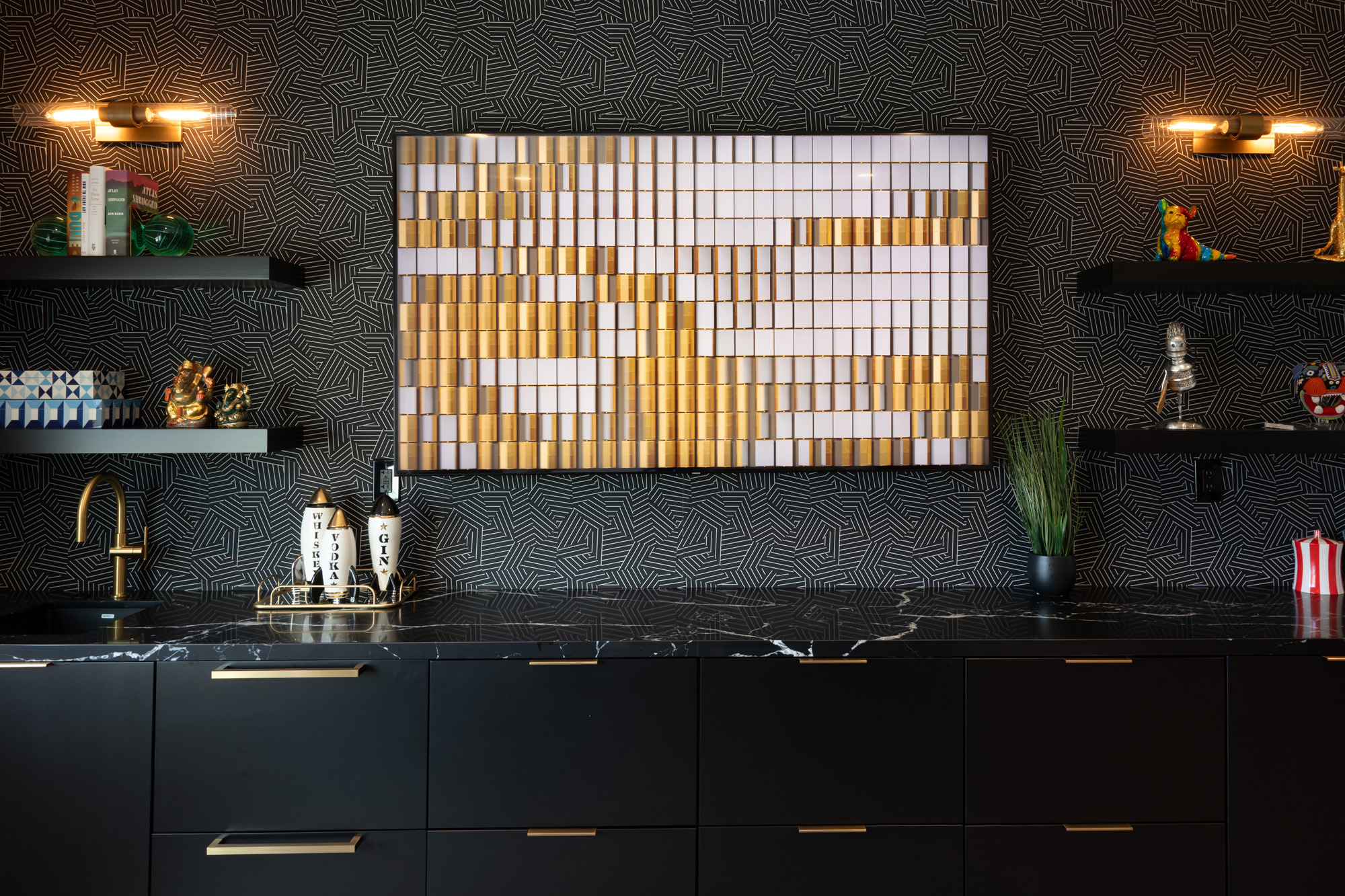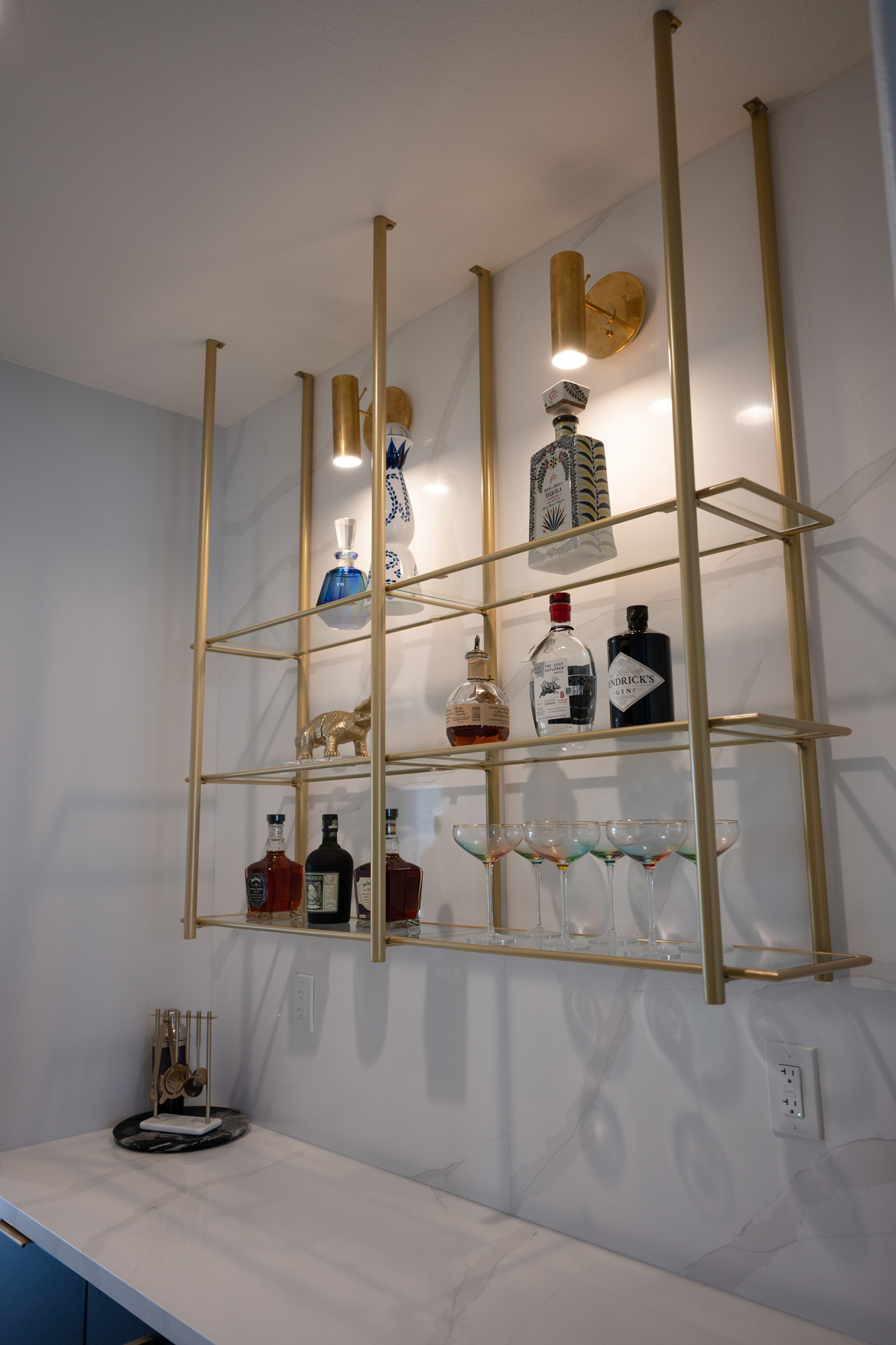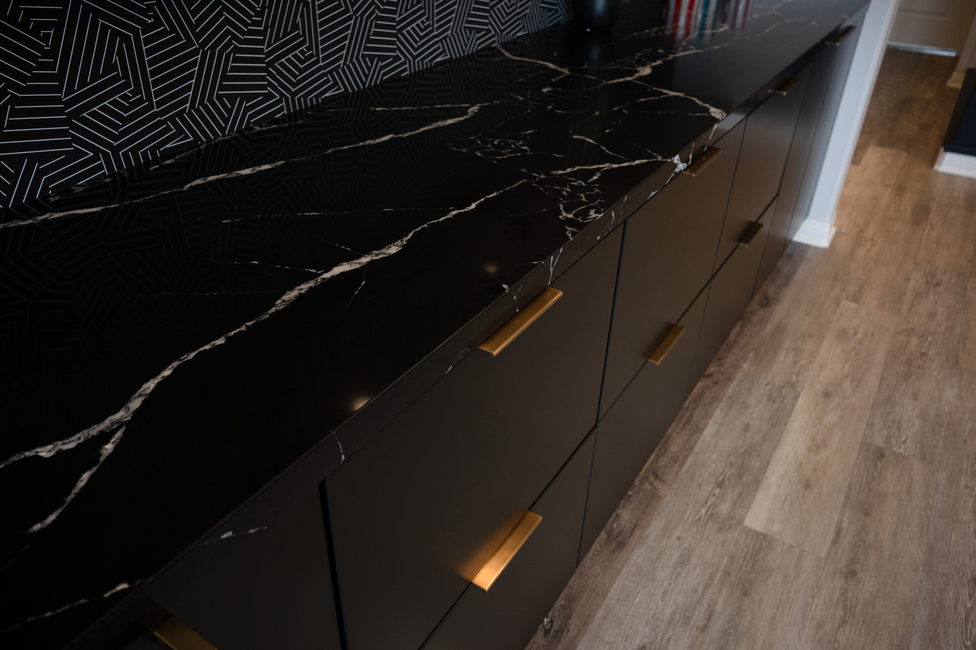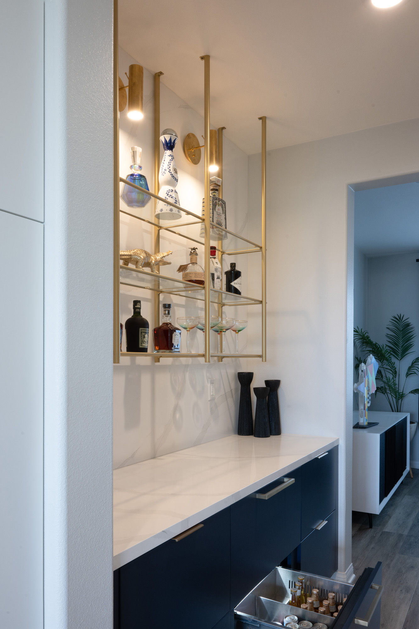 To address these challenges, we embarked on a strategic reconfiguration of the space. This involved creating a more open layout to enhance flow and functionality. We introduced high-end materials such as LG Viatera Quartz Calacatta Plata for the kitchen countertops and Mikado Quartz Calacatta Galaxy for the bar countertops. Modern pendant lighting and customized storage solutions were added to tie the new open-concept kitchen and bar areas with elegance and reflect the clients’ modern style.