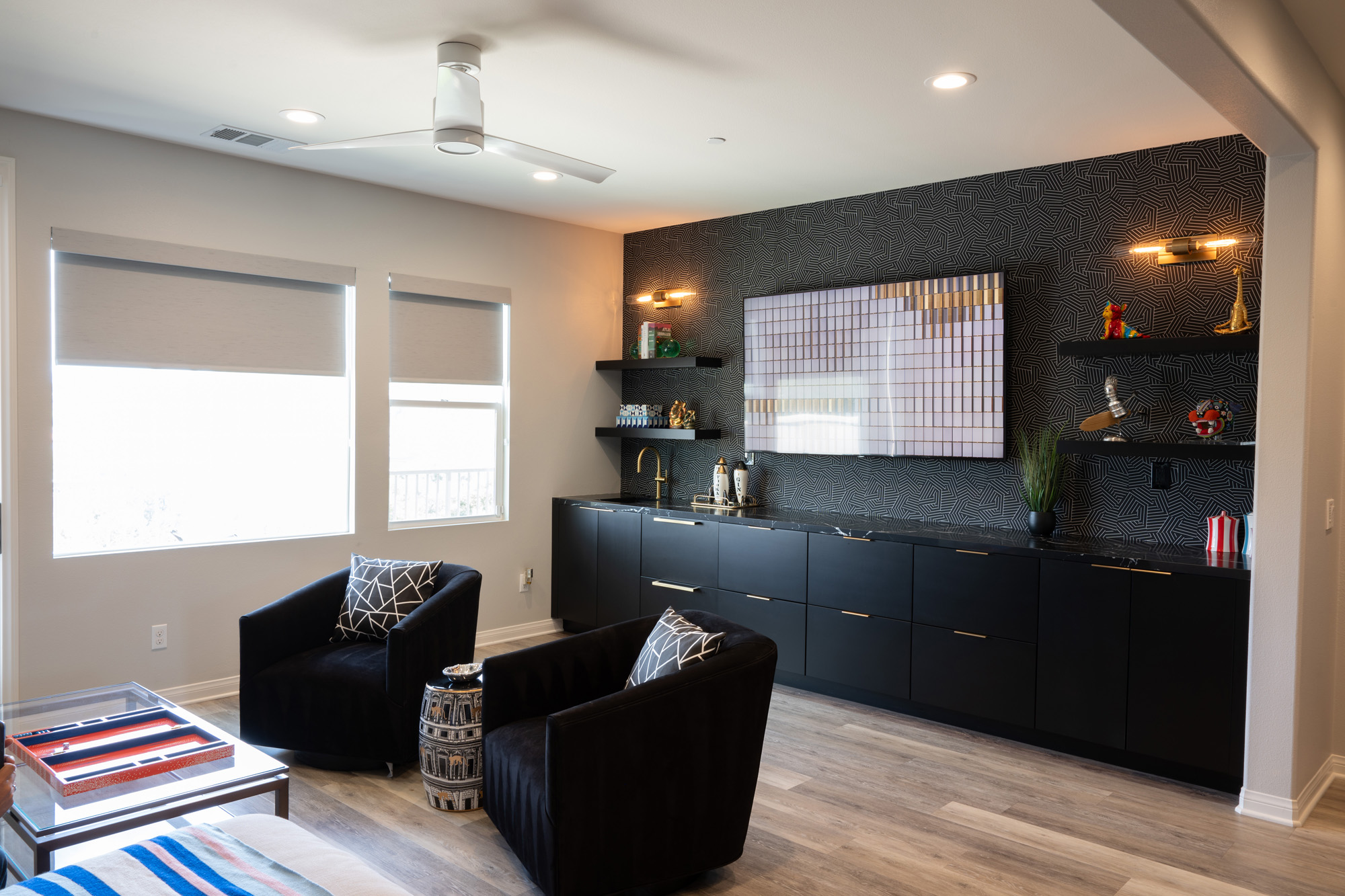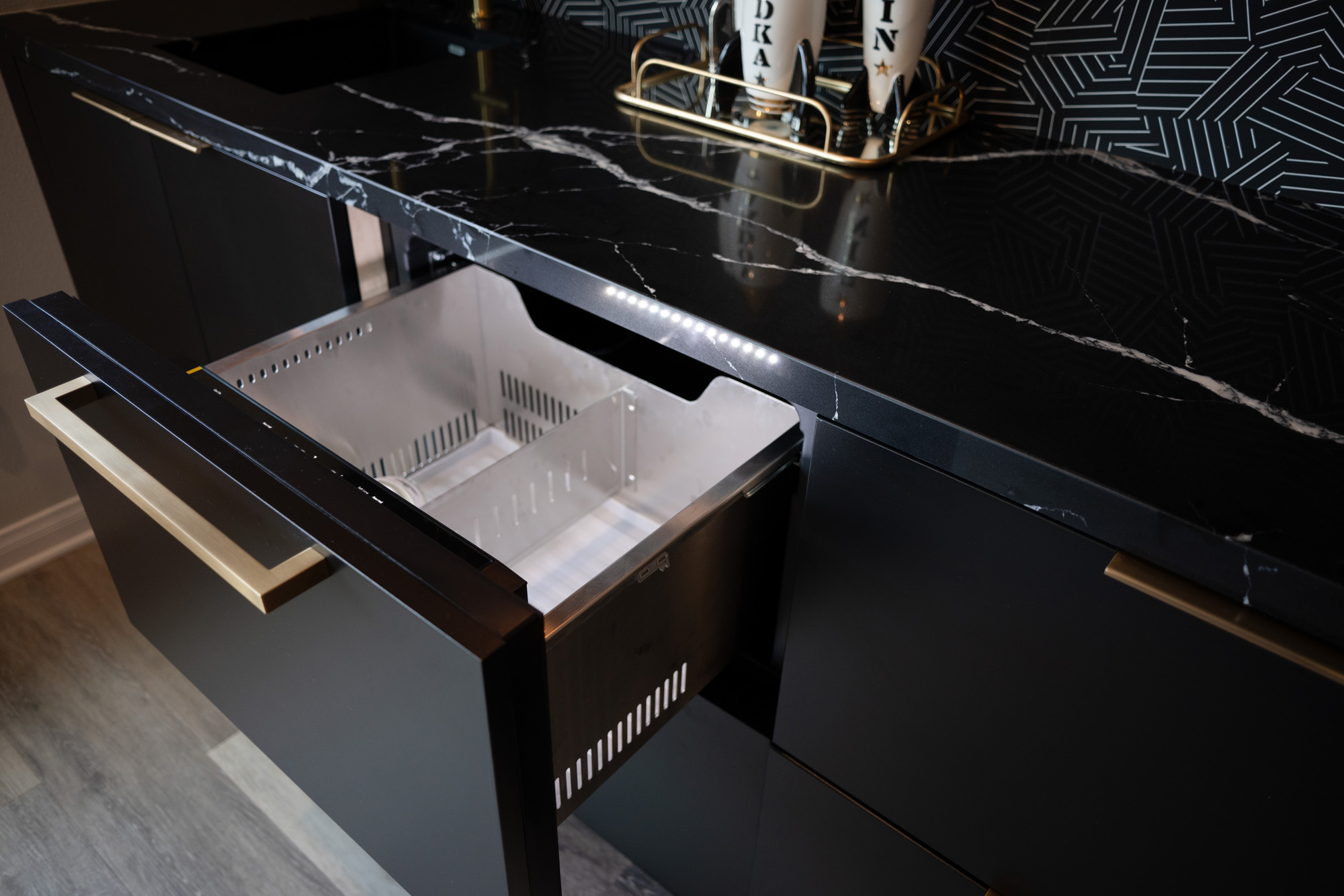 The upstairs bar features Mikado Quartz Calacatta Galaxy countertops, providing a sophisticated and elegant surface. This area is designed for entertainment and relaxation, making it a perfect spot for hosting gatherings.