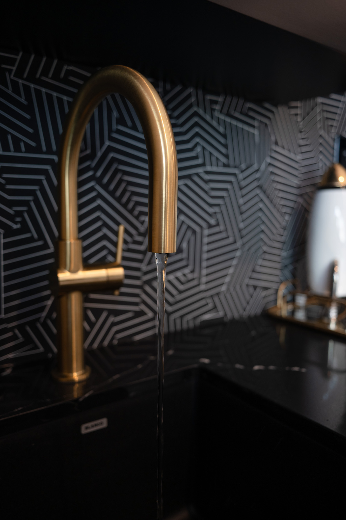 The kitchen was designed to be both functional and aesthetically pleasing. The LG Viatera Quartz Calacatta Plata countertops offer a luxurious feel, while the 2Modern Vega pendant light adds a modern touch. The kitchen now includes hidden storage solutions, maximizing space and maintaining a clean look.
