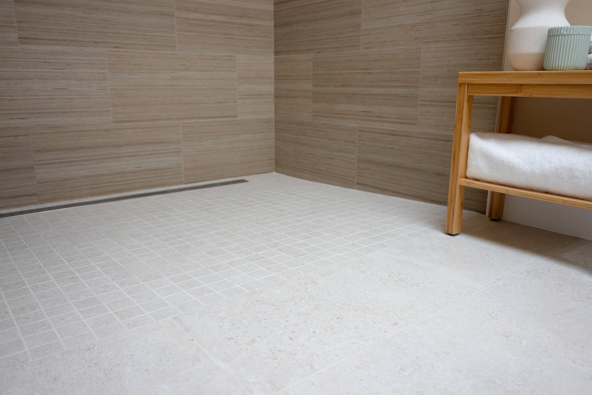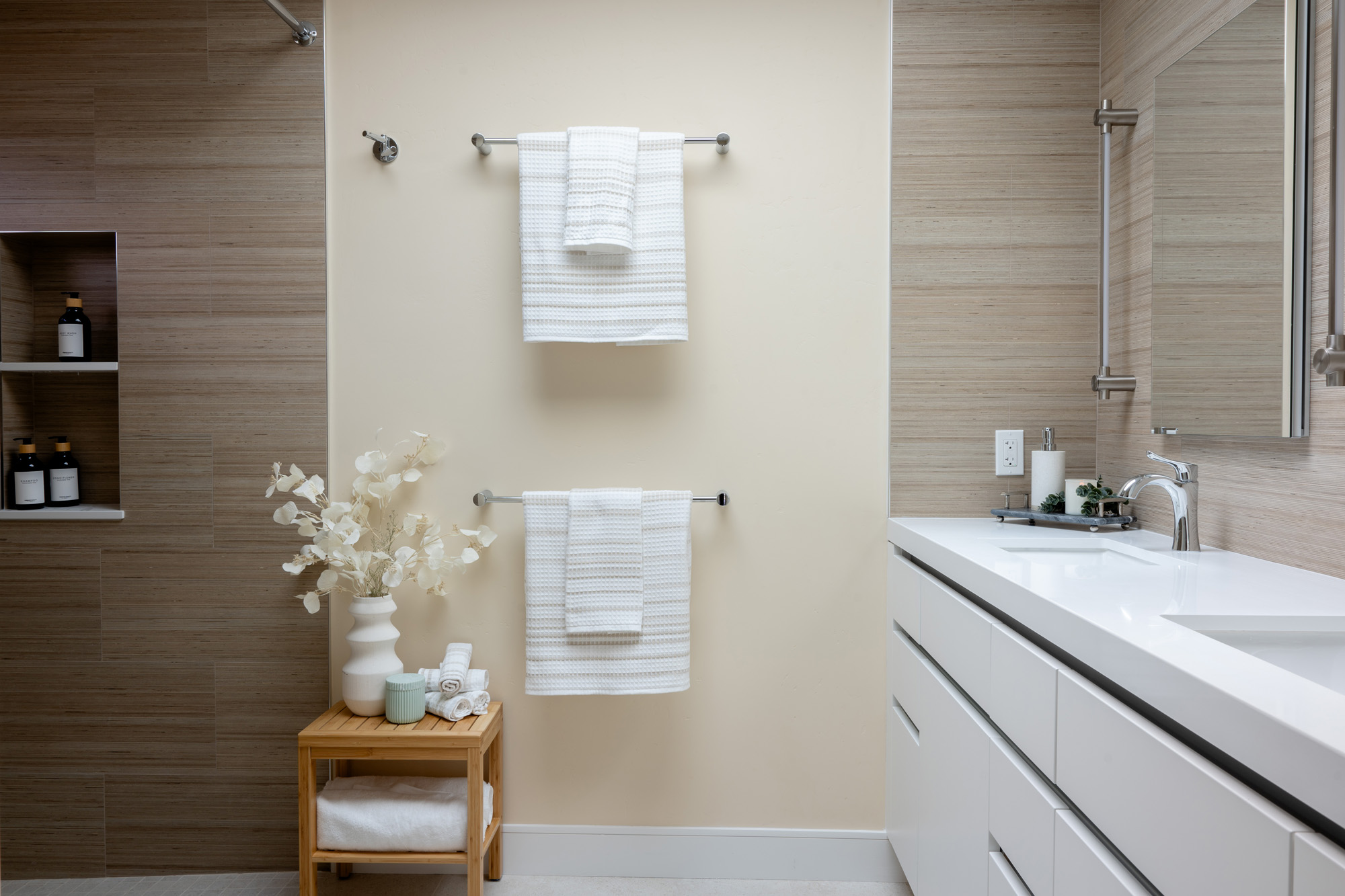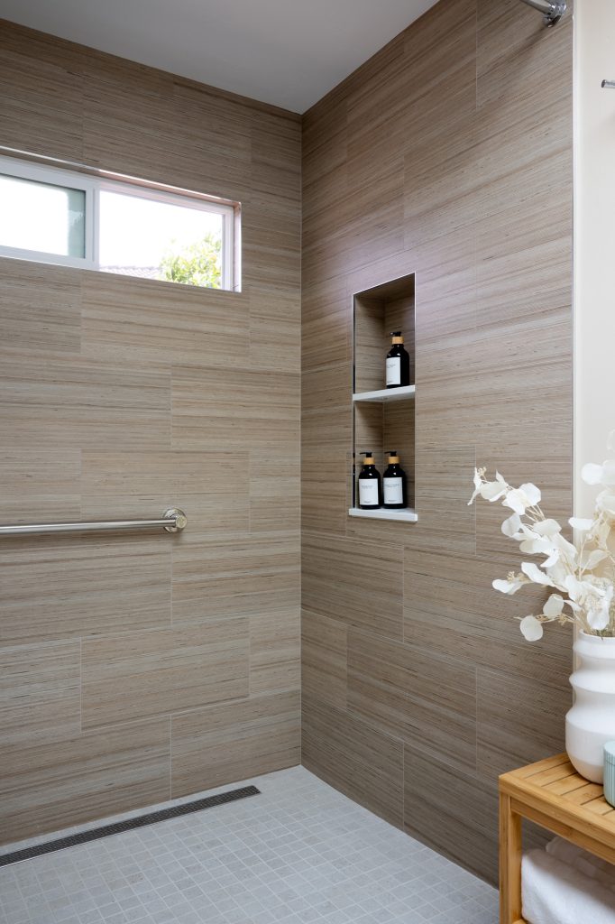Primary Shower Wall: Shiusa Crema—a luxurious and timeless material, adding an element of elegance to the primary shower with its soft, creamy tones.