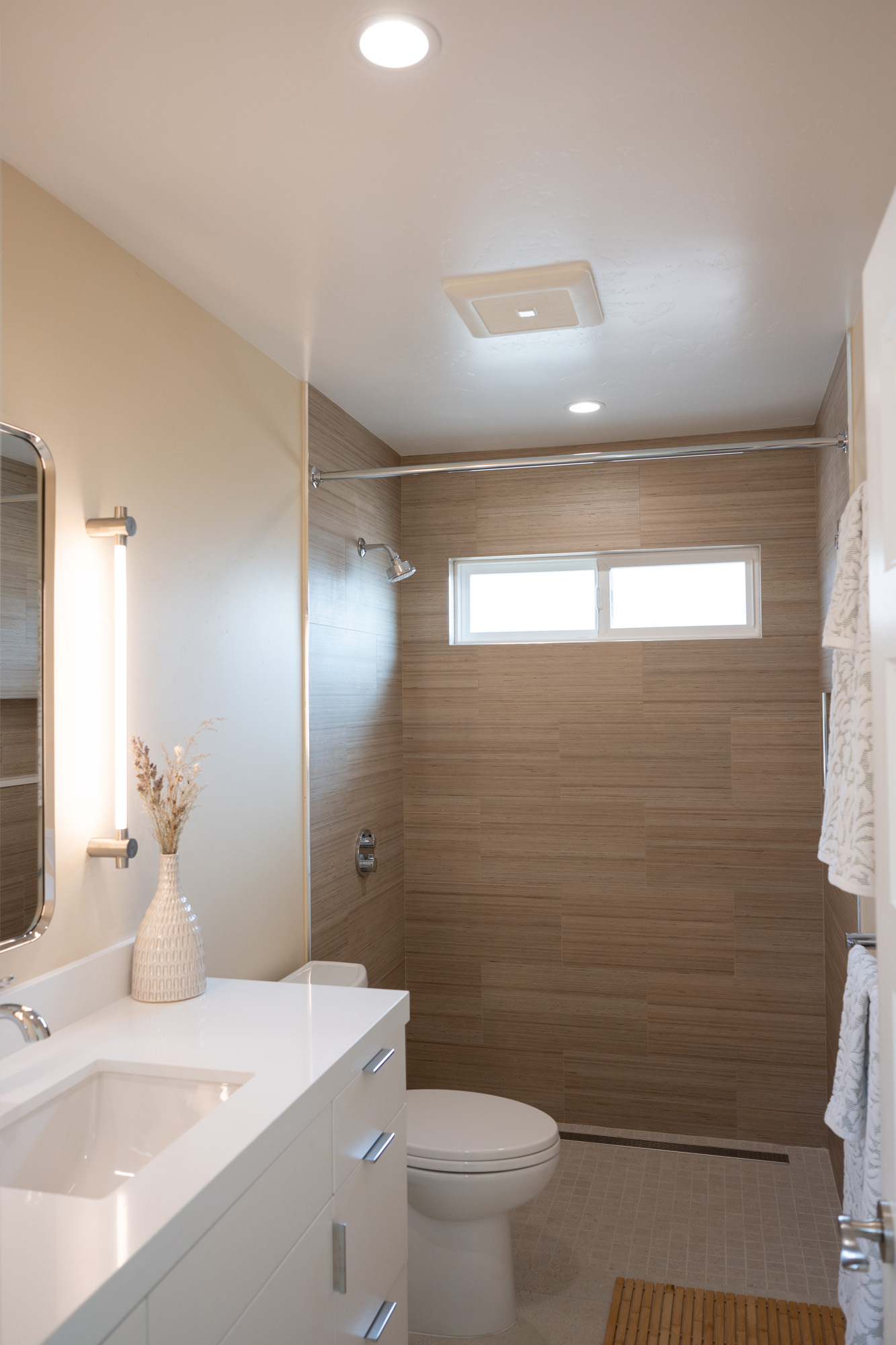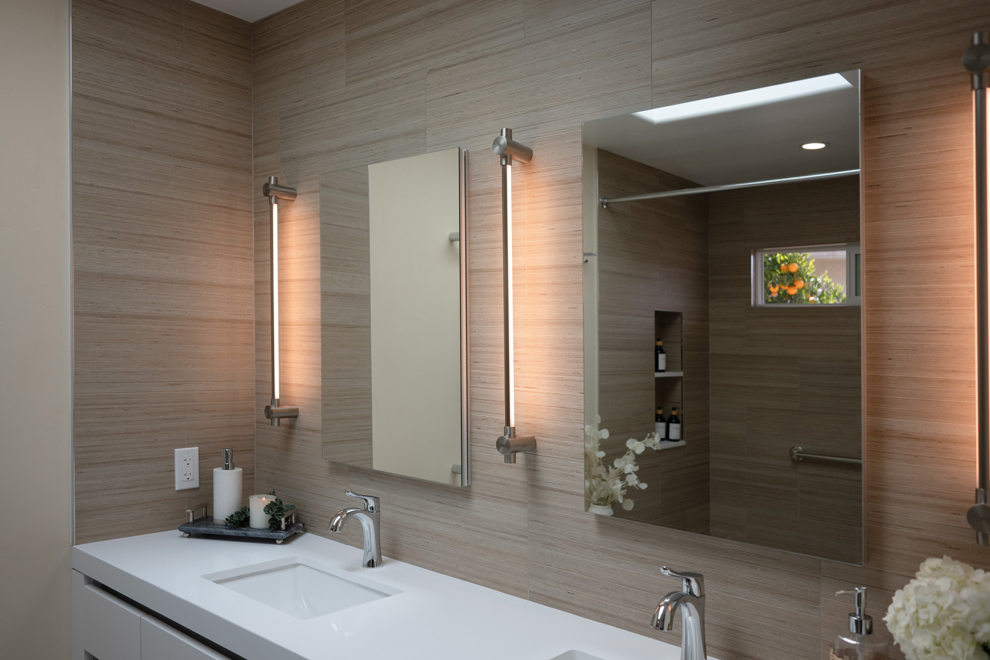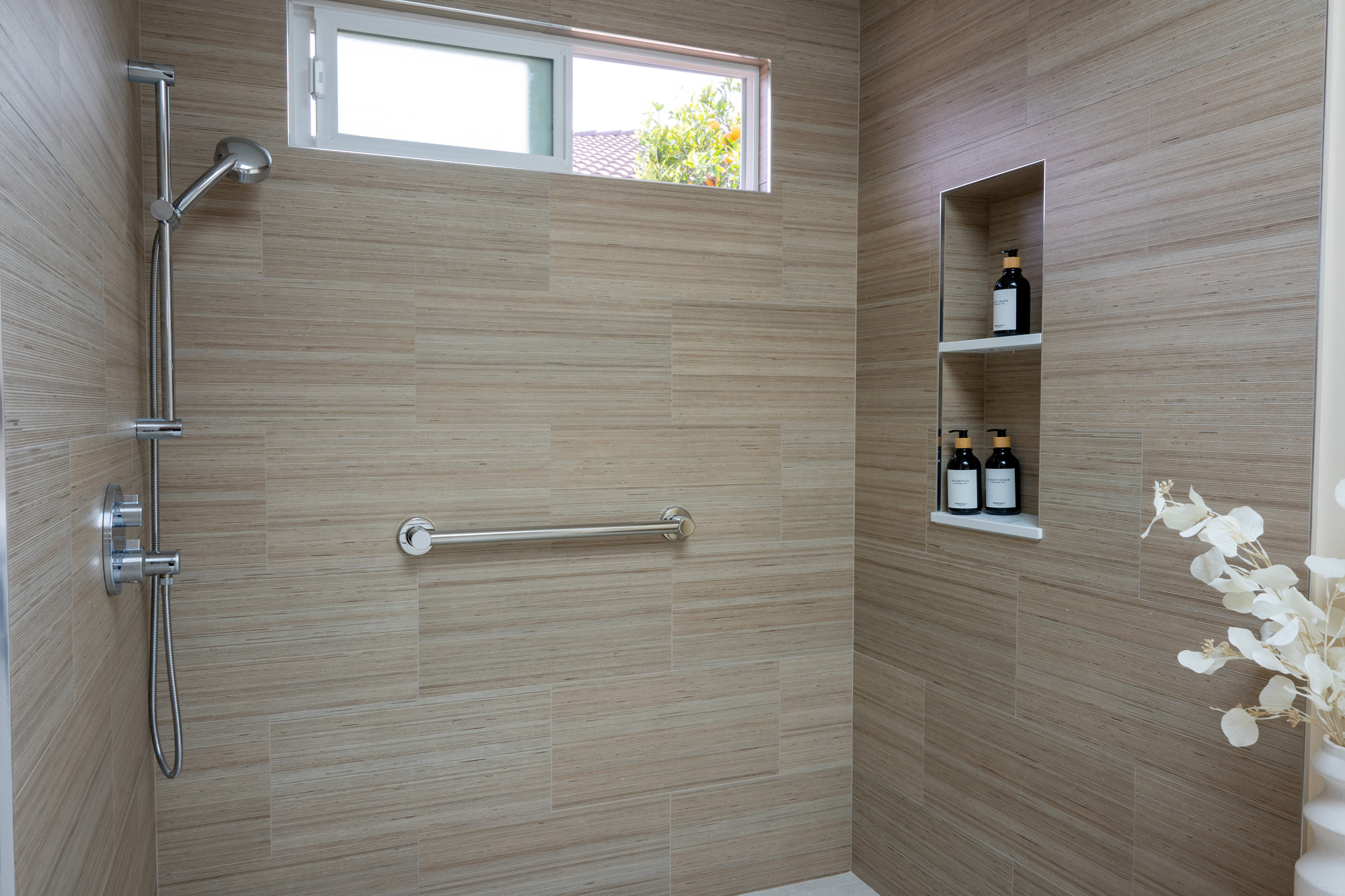 Primary Shower Wall: Shiusa Crema—a luxurious and timeless material, adding an element of elegance to the primary shower with its soft, creamy tones.