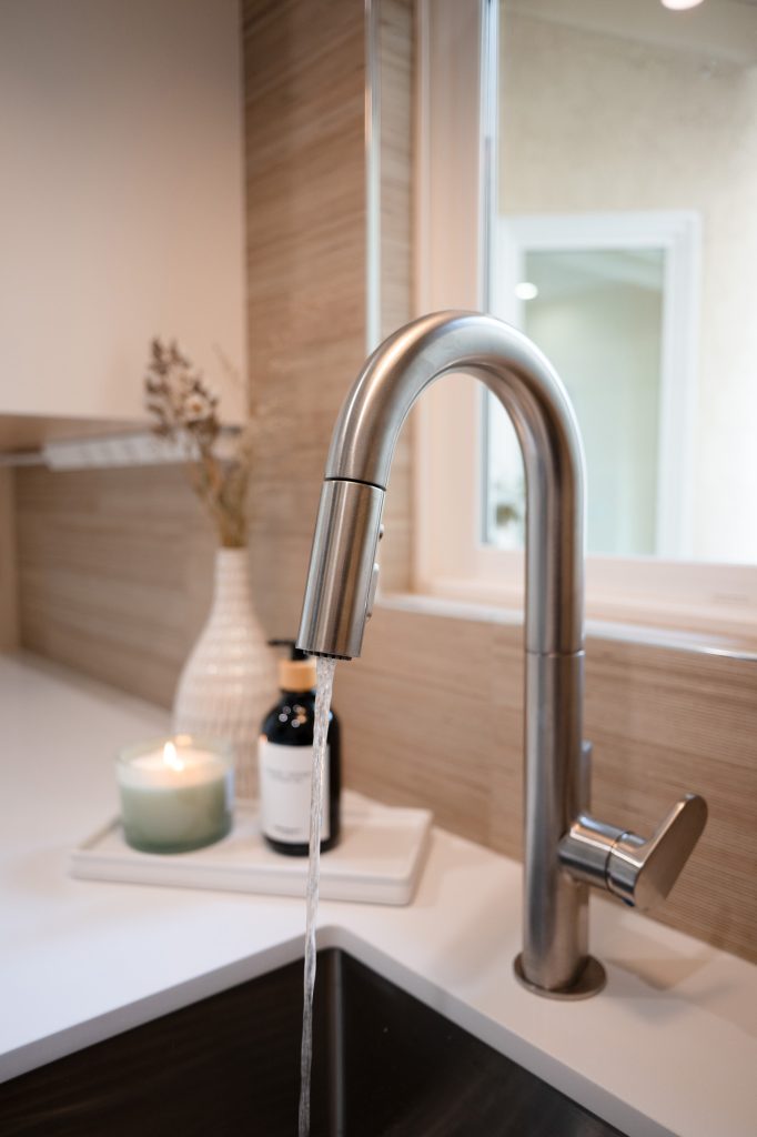 To address these challenges, we embarked on a strategic reconfiguration of the space. That involved creating a more open layout to enhance flow and functionality. We introduced high-end materials such as Crestwood Maple Cabinets for the kitchen and Nexxacore Aurora LVP for the flooring. Modern lighting and customized storage solutions were added to tie the new open-concept home with elegance and reflect the clients’ modern style.