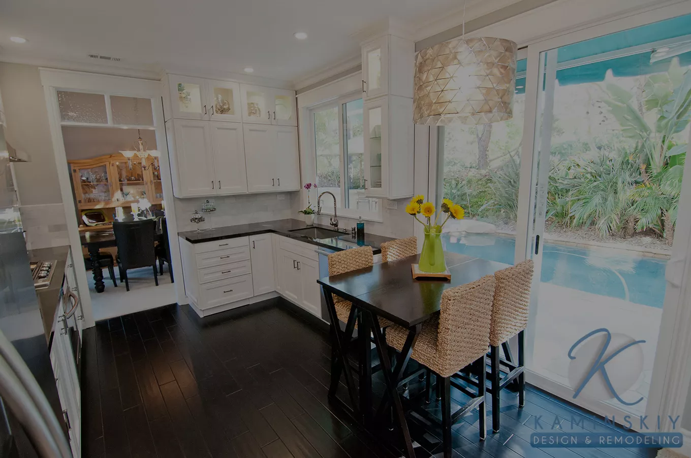 This San Marcos kitchen remodel features a gorgeous pool view and uses light colors to highlight the natural light coming from outside.