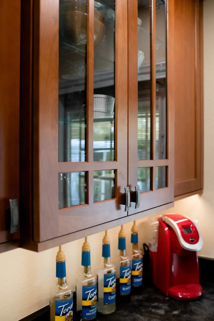 The beautiful drawer handles add a touch of sophistication to the kitchen, while the matching built-in kitchen appliances create a cohesive and stylish look. The butler’s pantry coffee and wine bar is a unique feature that adds convenience and luxury to your kitchen.
