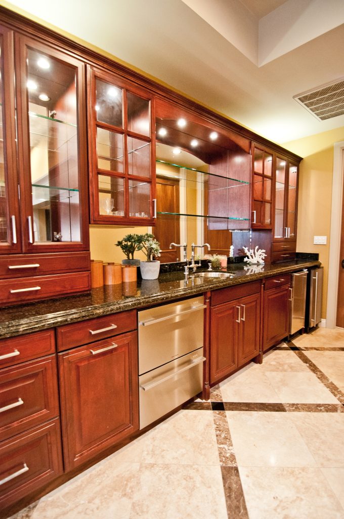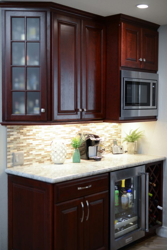 Cabinetry and open shelving are your go-to options for storage and display. Cabinets provide hidden storage for less frequently used items, while open shelves allow you to showcase your collection of fine spirits and glassware. Add adjustable shelving to accommodate various bottle heights.